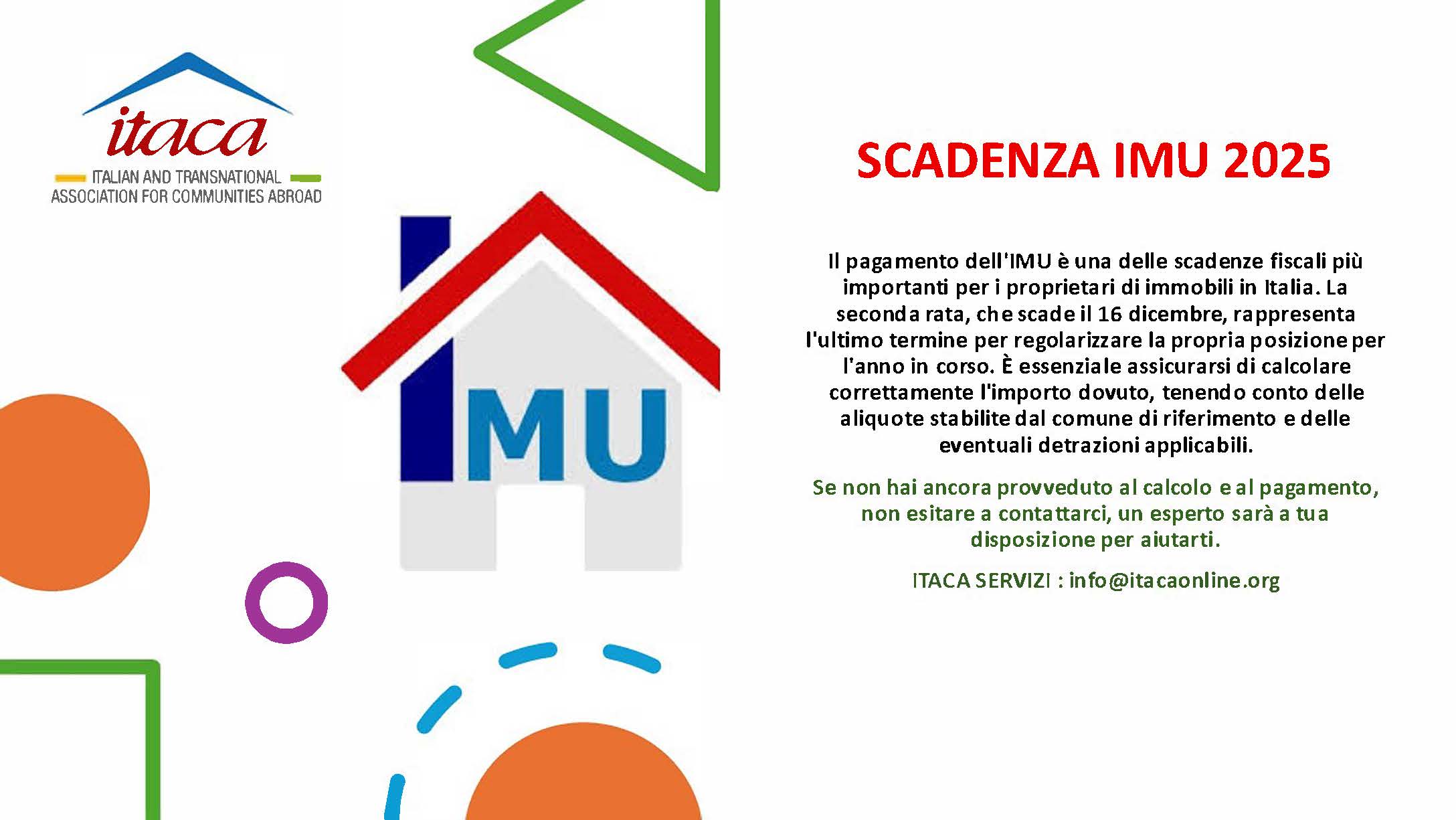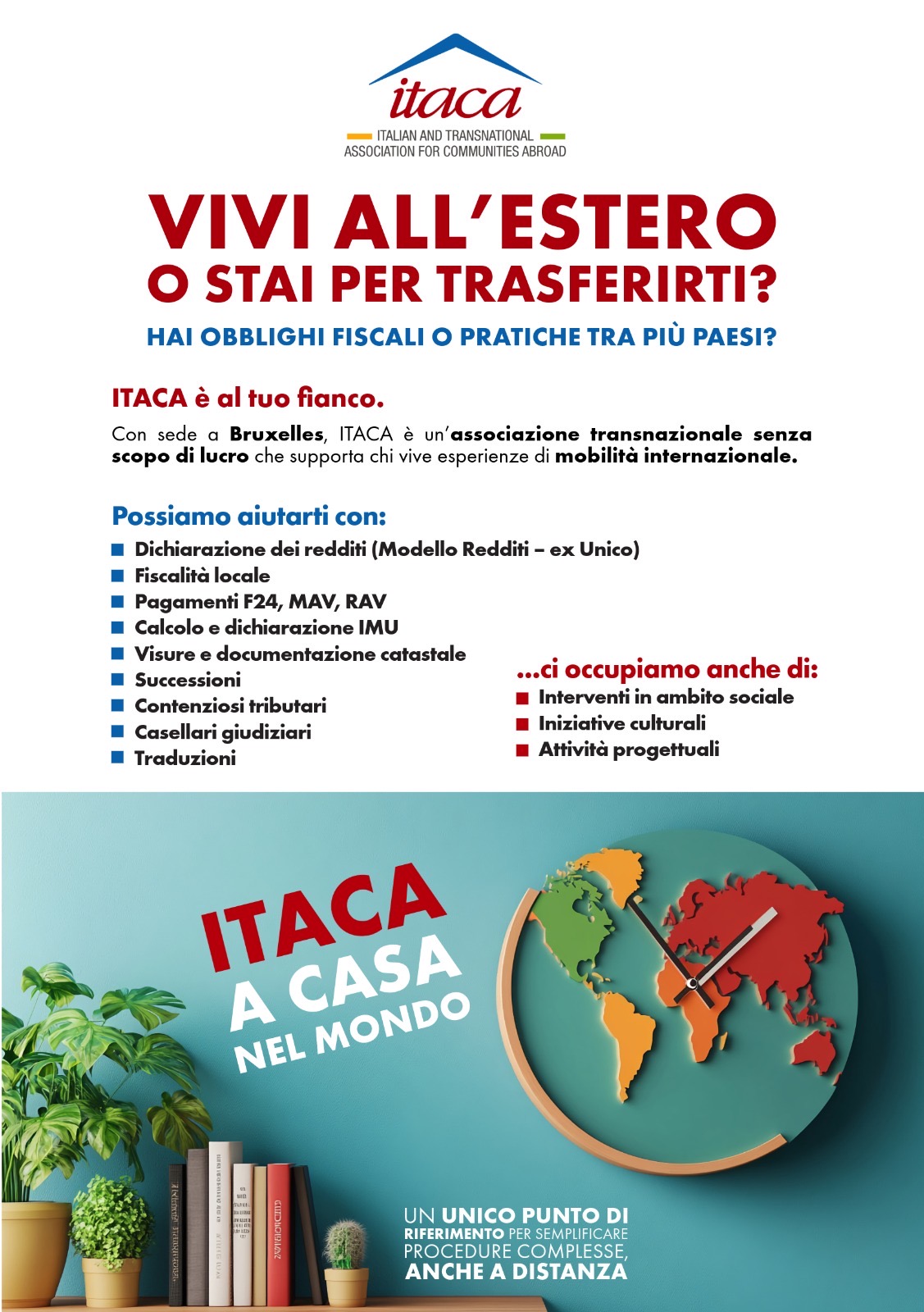 Notizie 🌍🟥Vivi all'estero o stai per trasferirti? Hai obblighi fiscali o pratiche tra più paesi? Itaca è al tuo fianco del 19 Marzo 2026. 🌍🟥Vivi all'estero o stai per trasferirti? Hai obblighi fiscali o pratiche tra più paesi? Itaca è... Accordo a Gran Canaria per integrare la tutela in ambito fiscale, previdenziale e assistenziale per gli Italiani residenti nelle Canarie del 1 Febbraio 2026. Rafforzare la tutela e ampliare i servizi rivolti agli italiani residenti nelle Canarie: è questo... ⚠️ Esonero Canone TV 2026 📺🚫 del 19 Gennaio 2026. Non possiedi un televisore in casa? Ricordati che hai tempo solo fino al 31 Gennaio per evitare... Scadenza IMU 2025 del 4 Dicembre 2025. Il pagamento dell'IMU è una delle scadenze fiscali più importanti per i proprietari di immobili in... Italiani all’estero, a Valenciennes il confronto tra Itaca, Inca-Cgil Francia e USEF del 25 Novembre 2025. Valenciennes, 21 novembre 2025 L' associazione Itaca, Inca-Cgil Francia, insieme alla storica... Assemblea con la comunità italiana a Valenciennes 31 maggio 2025 del 23 Maggio 2025. Indietro Avanti